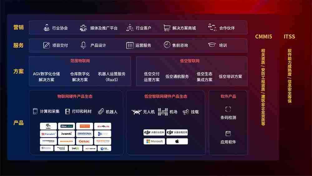 聚合国内外先进的物联网硬件产品品牌,,聚焦数字化仓储、、机器人运营、、低空智联网等领域,,共同打造适合客户业务场景的解决方案并提供交付服务